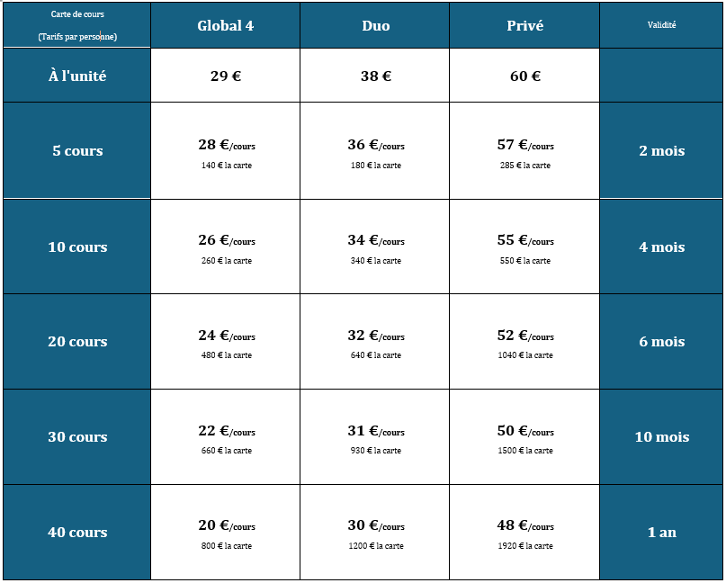 - Les cours à la carte doivent être annulés au moins 24 heures à l’avance, sans quoi le cours sera décompté de la carte.(En cas d’empêchement, il est possible, sous réserve de disponibilité, d’effectuer un rattrapage sur un autre créneau de la même semaine.)